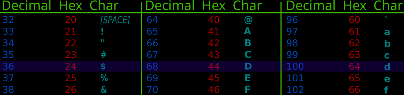 (image modified from wiki media about ASCII. Hex refers to hexadecimal)