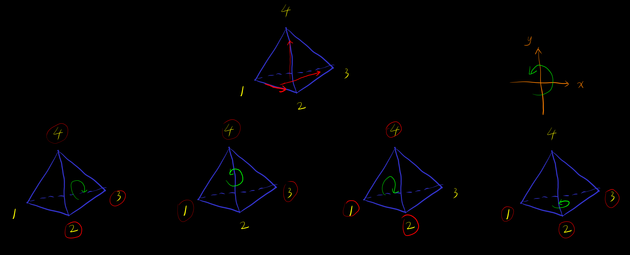 Example 四面体, 右手定则, 拇指指向四面体内部得到边界方向 (图片的顶点的指标从 而不是 开始)
